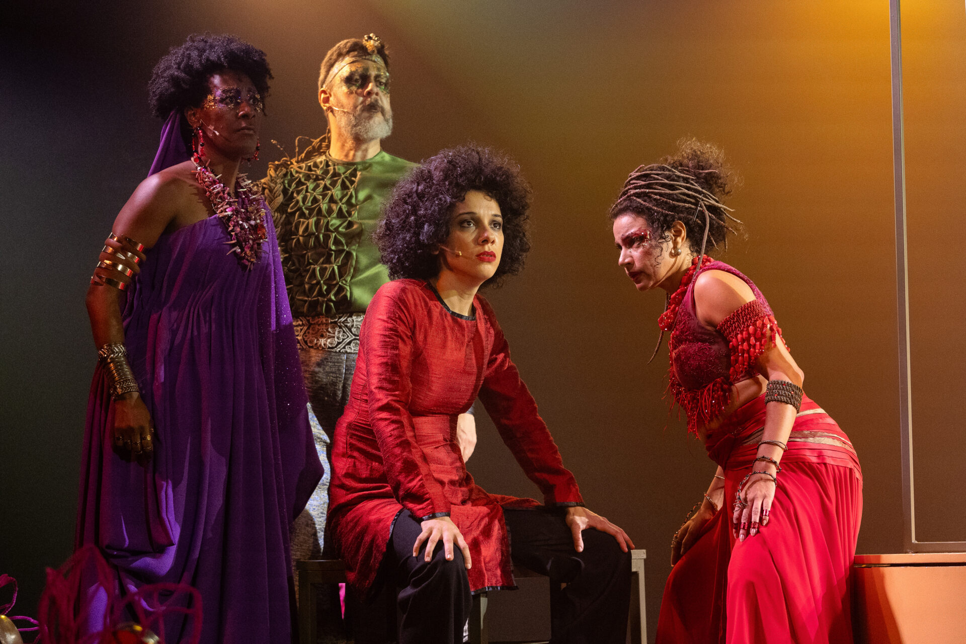 O ambiente do 033 Rooftop já serviu de cilada para algumas montagens ali vistas. Marília e Montanheiro, entretanto, íntimos do espaço, afinal já trabalharam lá outras vezes, criaram uma encenação em três palcos que não dispersa a atenção do púbico, favorecida pelo cenário de Carmem Guerra. Tal divisão, inclusive, é o segredo para a presença dos personagens dos deuses Ereskigal, Gilgamesh e Inana. Tal como o clássico cenário de Tomás Santa Rosa (1909-1956) para a montagem de Vestido de Noiva, de Nelson Rodrigues (1912-1980) em 1943, com seus três planos, tudo está lá ao mesmo tempo, mas se transforma em elemento narrativo diante do foco da iluminação, desenhada por Gabriele Souza.