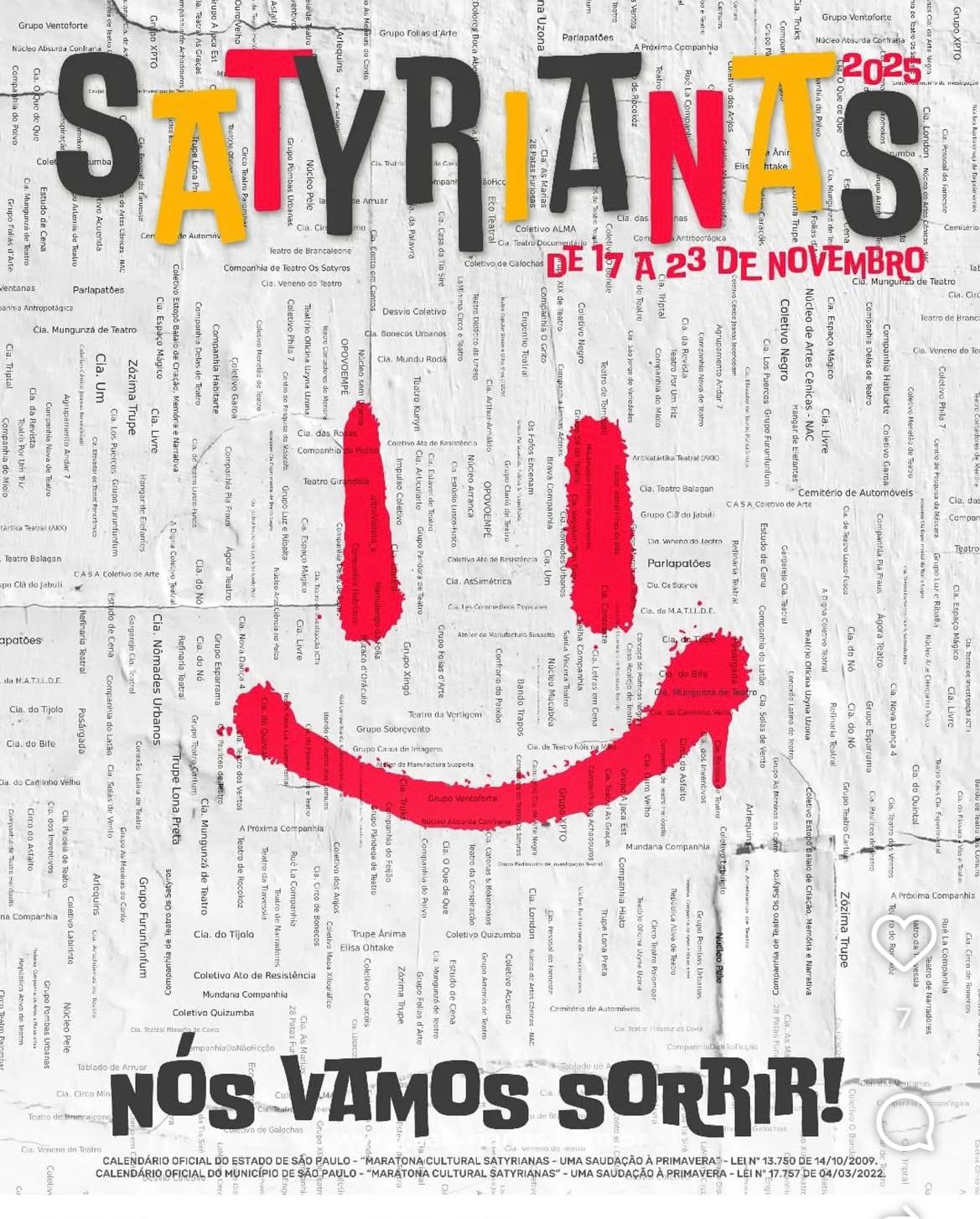 Inspirada na frase do filme Ainda Estou Aqui, de Walter Salles, o Festival Satyrianas 2025 celebra o poder transformador da arte e da resistência com o tema “Nós vamos sorrir”, homenagem à resiliência da cultura brasileira, à dignidade dos artistas e, especialmente, ao universo do circo e do palhaço. Nesta edição, o festival – que integra o Calendário Oficial da Cidade e do Estado de São Paulo – presta tributo ao grupo Parlapatões, parceiro histórico d’Os Satyros no fortalecimento da cena artística do centro de São Paulo, na Praça Roosevelt. A homenagem se estende a Hugo Possolo e Raul Barretto, figuras fundamentais do teatro e do humor no país. A Satyrianas 2025 estará concentrada na região da Praça Roosevelt, nos seguintes espaços: Cine Satyros Bijou, Espaço dos Satyros, Espaço Parlapatões, Lona Satyrianas, Mamadi, SP Escola de Teatro, Studio Satyros e Tenda Satyrianas, além dos eventos que ocorrerão em duas áreas abertas na Praça Roosevelt. Além do Esquenta e da Abertura, que acontecerão na segunda, terça e quarta feiras, a partir de quinta-feira a Satyrianas contará com 80 horas ininterruptas de programação. Eventos acontecem do dia 17 até meia-noite do dia 23 de novembro.