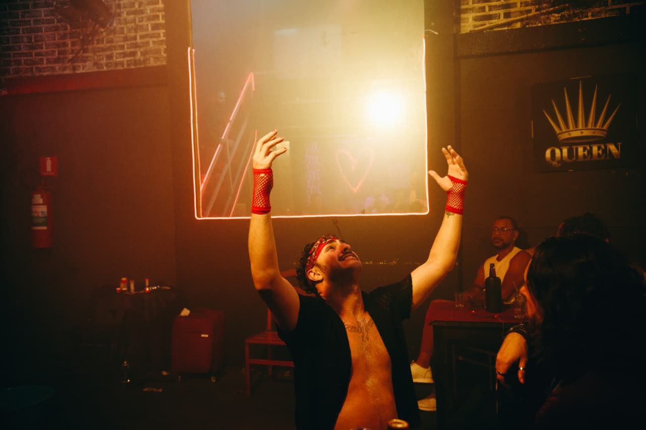 O ambiente de cabaré do Bar Queen amplifica a estética e a linguagem do Coletivo CIATRÔ, que desafia a narrativa do sofrimento. O espetáculo é uma declaração de força: as bruxas e as bichas não morrem — resistem, cantam, dançam e reinventam o mundo sob um sol vermelho, incandescente, transformando cada cena em um poderoso grito de liberdade.