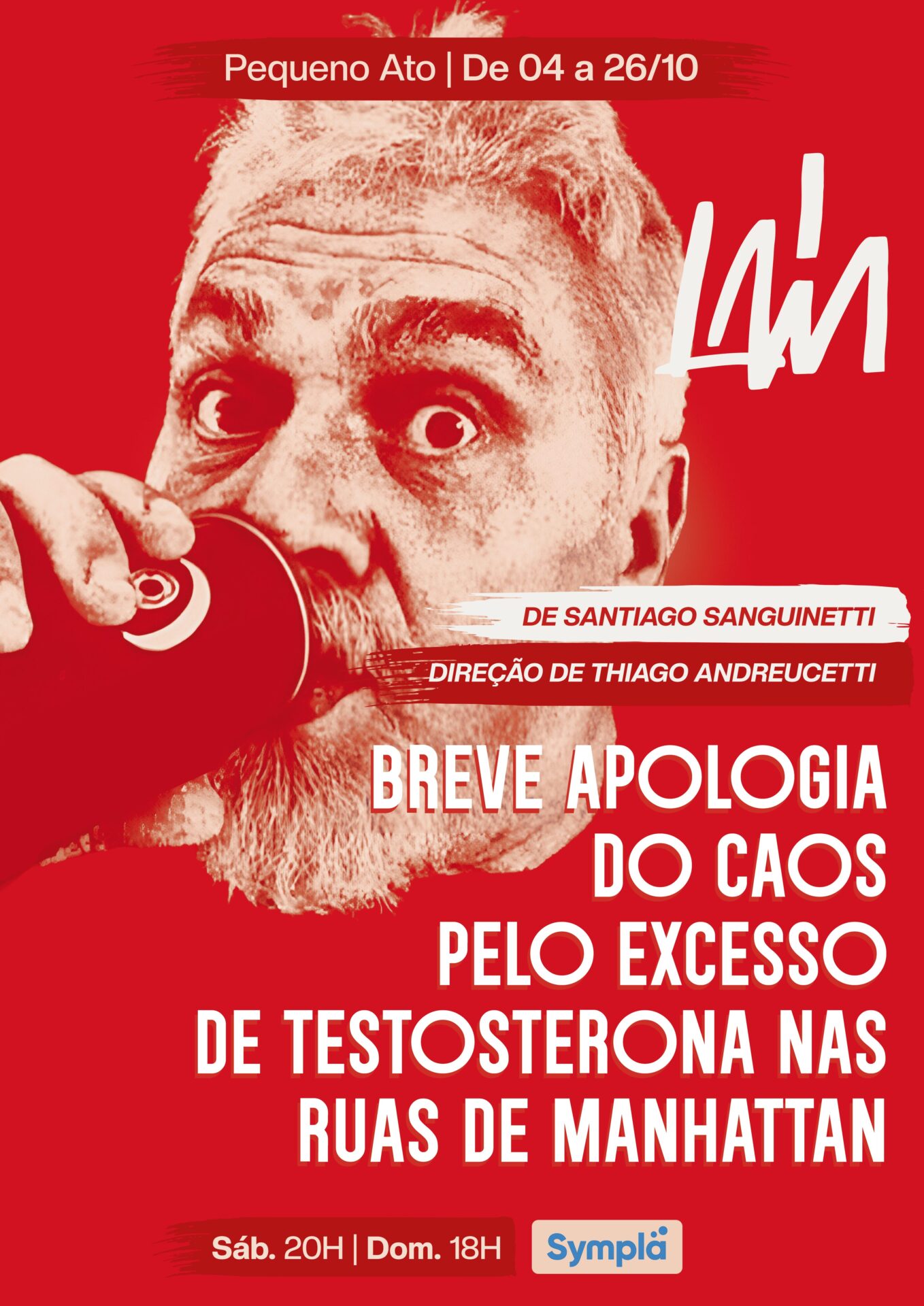 Laia do Teatro estreia espetáculo inédito no Brasil Breve apologia do caos pelo excesso de testosterona nas ruas de Manhattan, do uruguaio Santiago Sanguinetti, no Pequeno Ato, em outubro