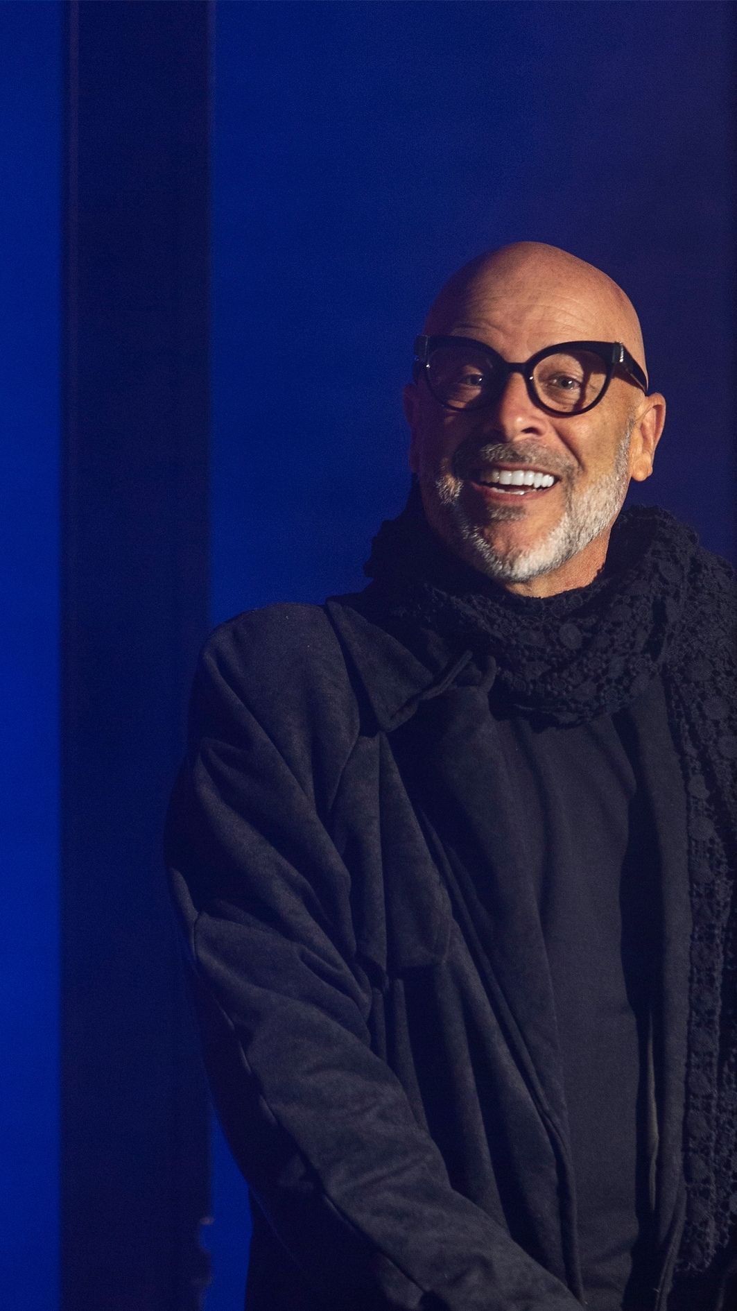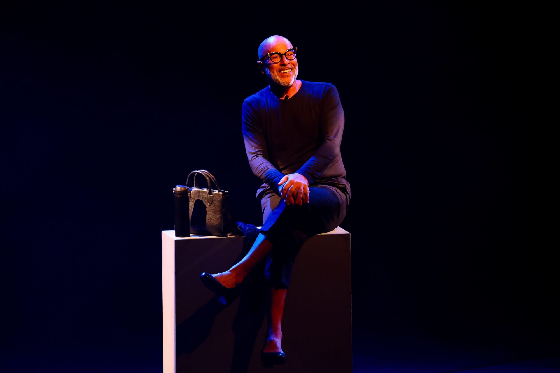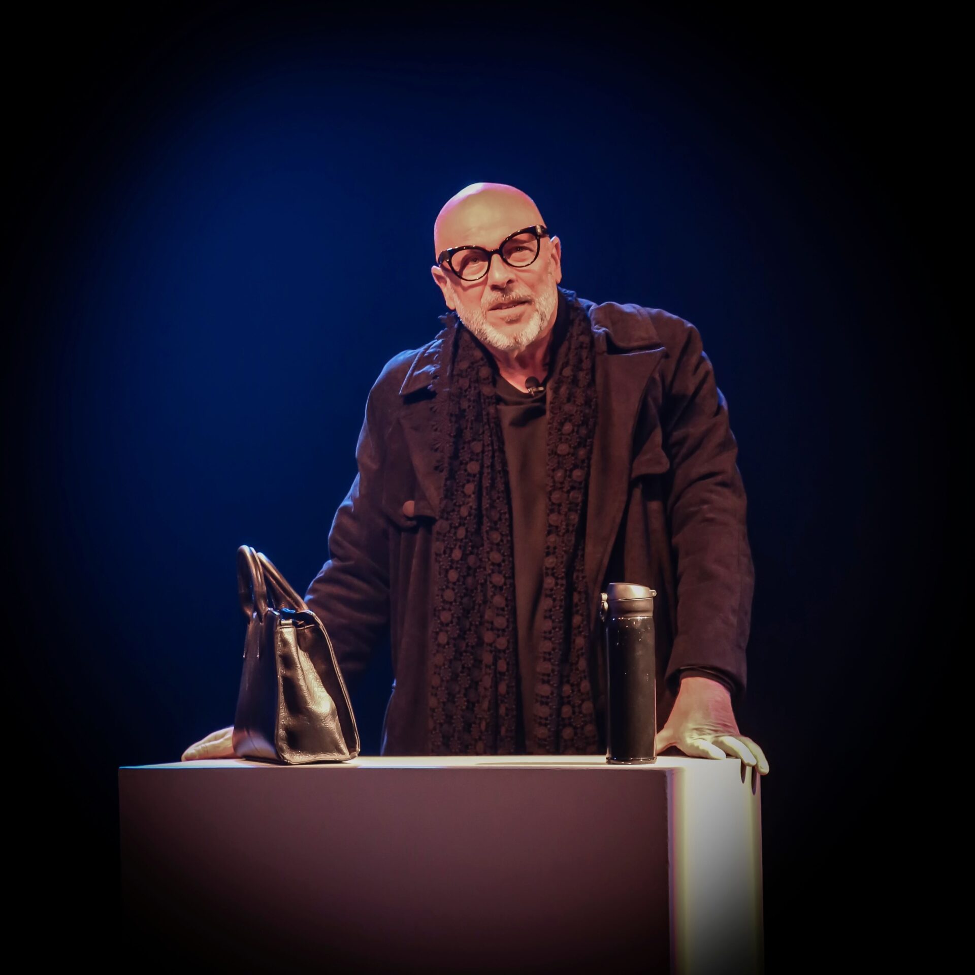 O premiado ator, diretor e autor de teatro Eduardo Wotzik, de barba e salto alto, dá vida a importante cientista política do Século XX em Hannah Arendt – Uma Aula Magna
