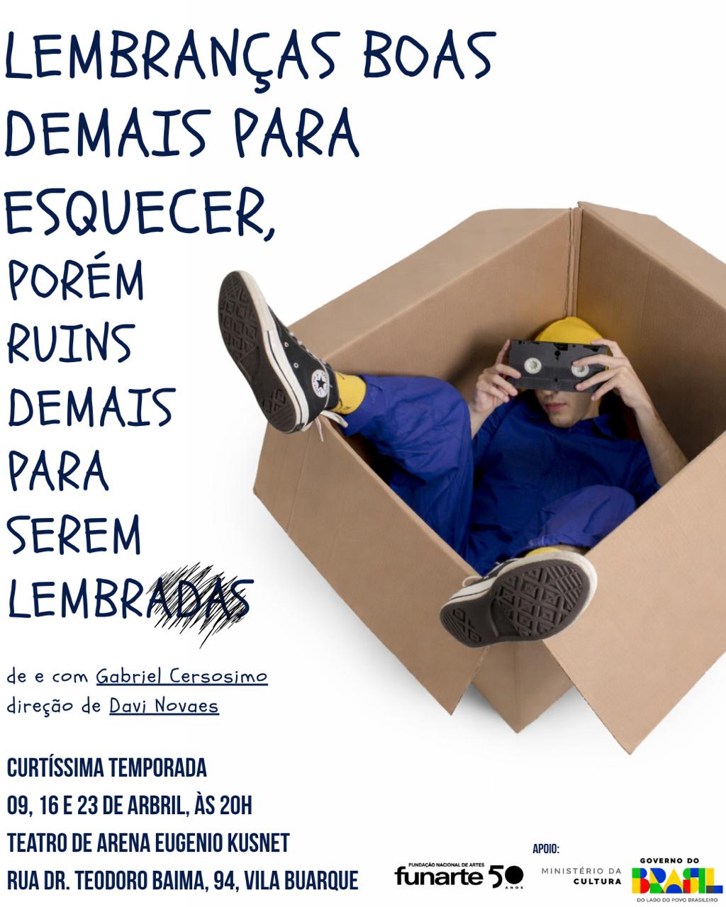 Comemorando dois anos da primeira temporada, depois de impactar mais de 400 espectadores e fazer uma sessão lotada no festival Satyrianas, Gabriel Cersosimo revisita seu monólogo, dirigido por Davi Novaes, agora no histórico Teatro de Arena Eugenio Kusnet!