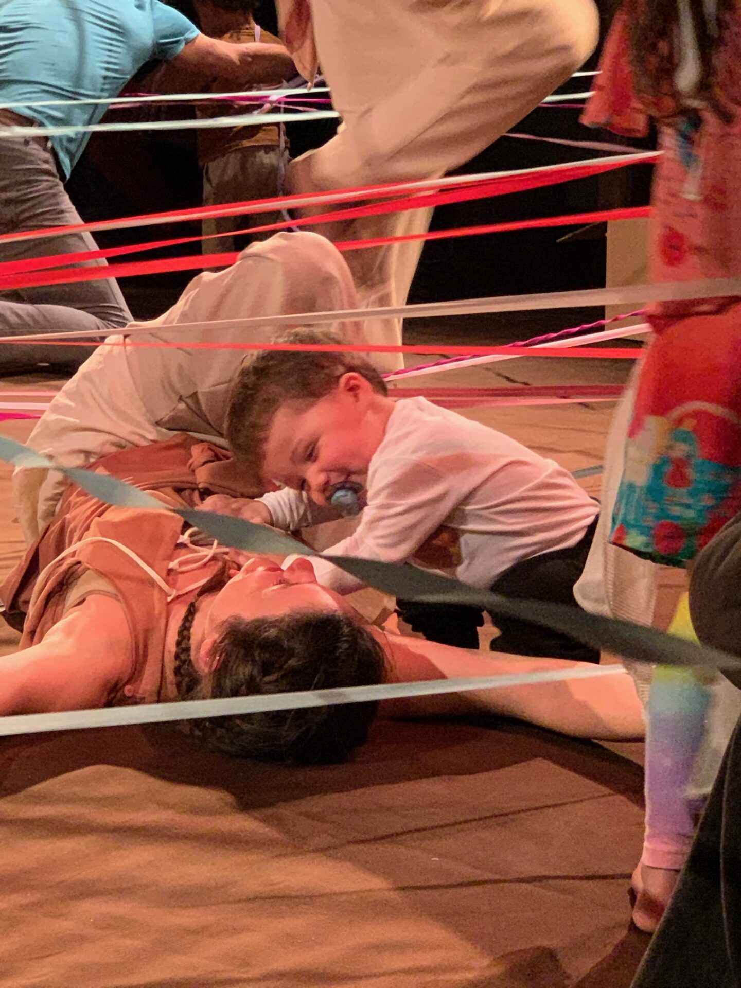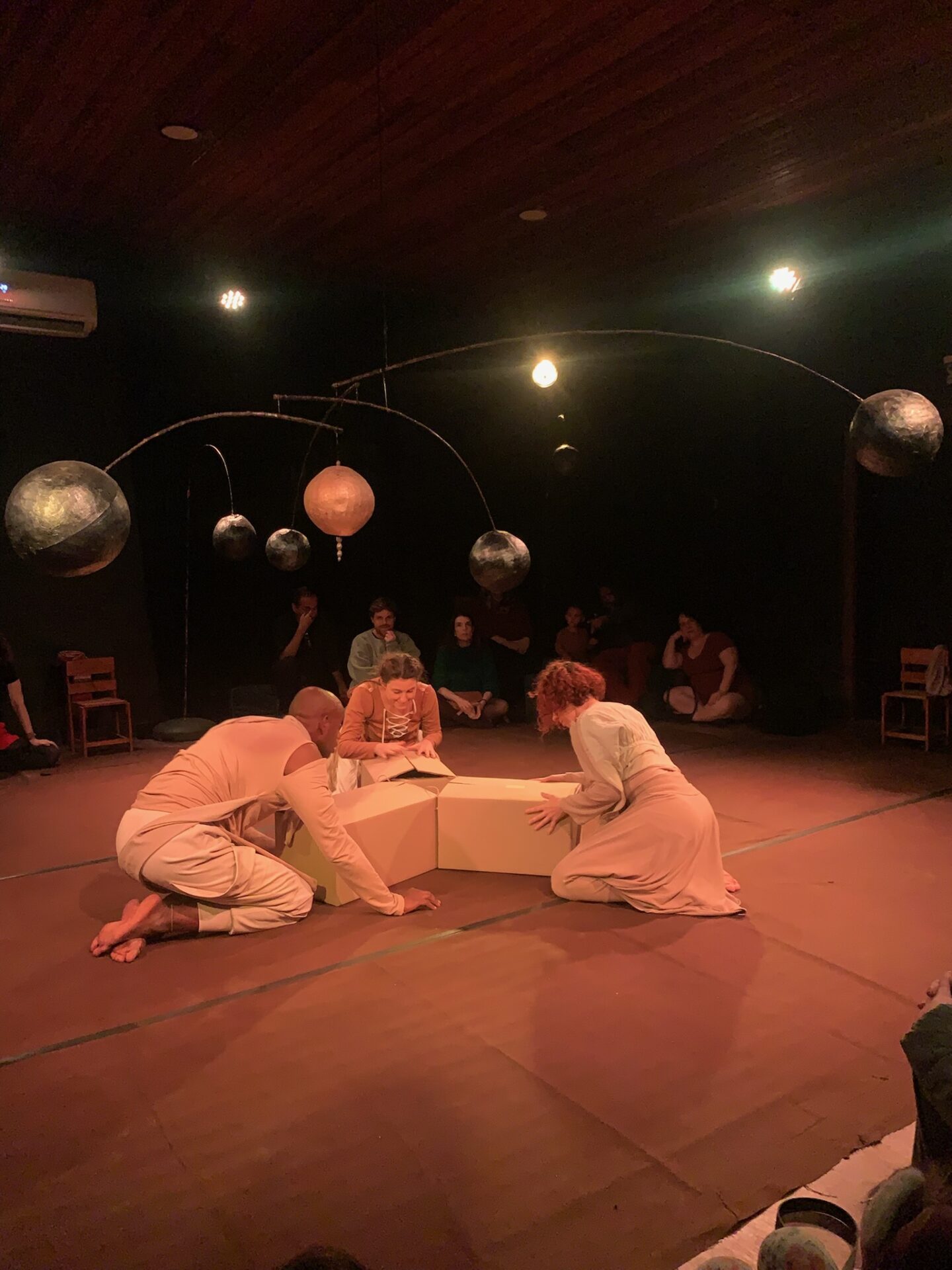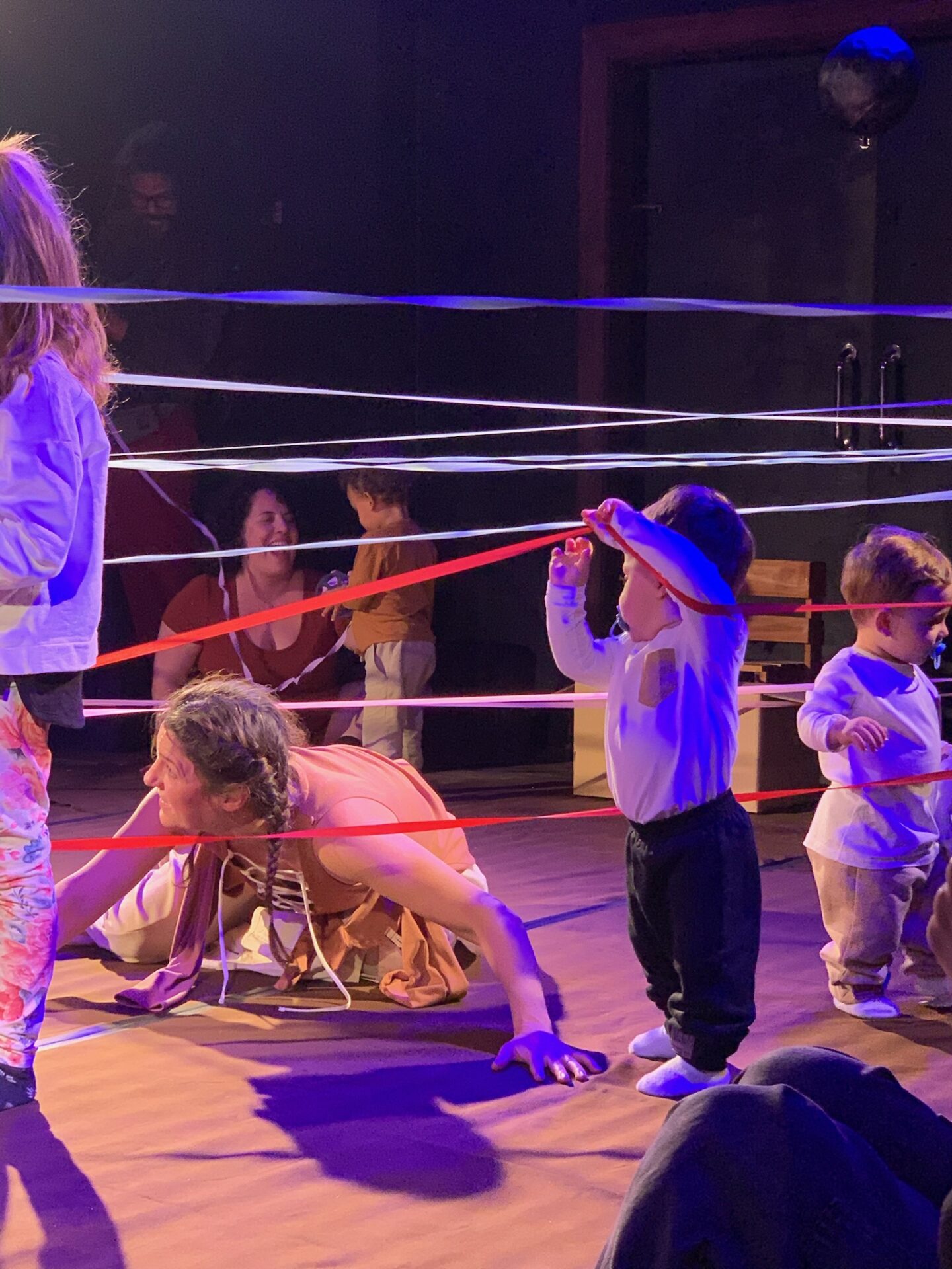 No espetáculo a Cia O Que de Que abre um espaço de encantamento para bebês e famílias. Formas amplas evocam um cosmos em nascimento; esferas repousam como planetas em suspensão. Papéis viram balões, barcos e aviões; fitas tecem uma grande cama de gato; pequenas manivelas afinam o silêncio. O nascer do universo encontra o nascer dos bebês: potências de novos mundos — lembrando aos pais gestos simples que, ao longo do tempo, foram sendo esquecidos, mas que renascem no ato de compartilhar presença com seus filhos.