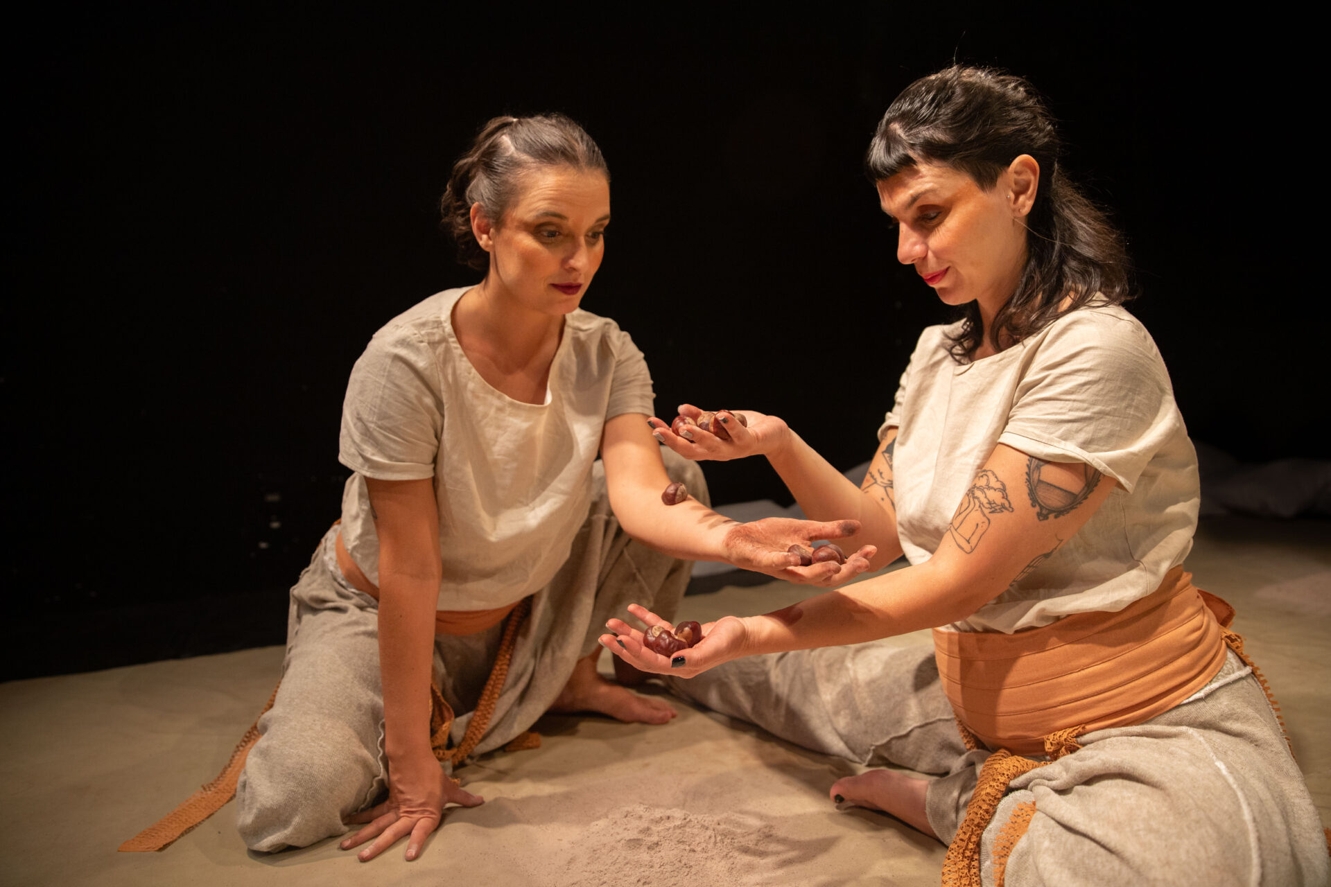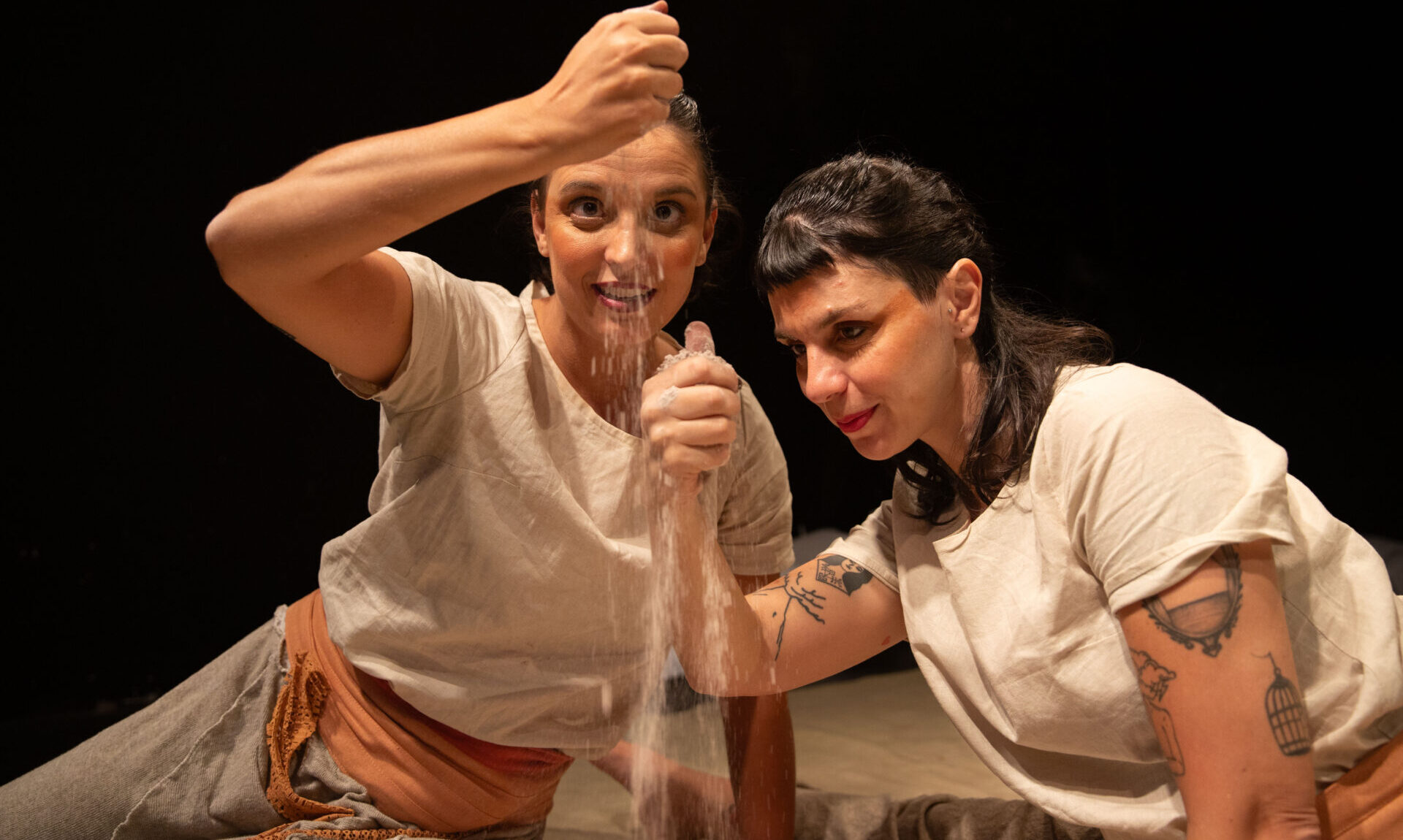 Com direção e dramaturgia de Júlia Mariano e Thiane Lavrador, que também estão em cena, RUPESTRE – o que a terra conta não se propõe a narrar uma biografia ou explicar conceitos arqueológicos. O desafio é outro: transformar memória ancestral em linguagem sensível. “Nosso grande desafio artístico é transformar qualquer tema em linguagem poética. O espectador não deve esperar uma narrativa linear que vá ‘contar uma história’, mas sim uma criação inspirada por essas fontes”, afirma Júlia.