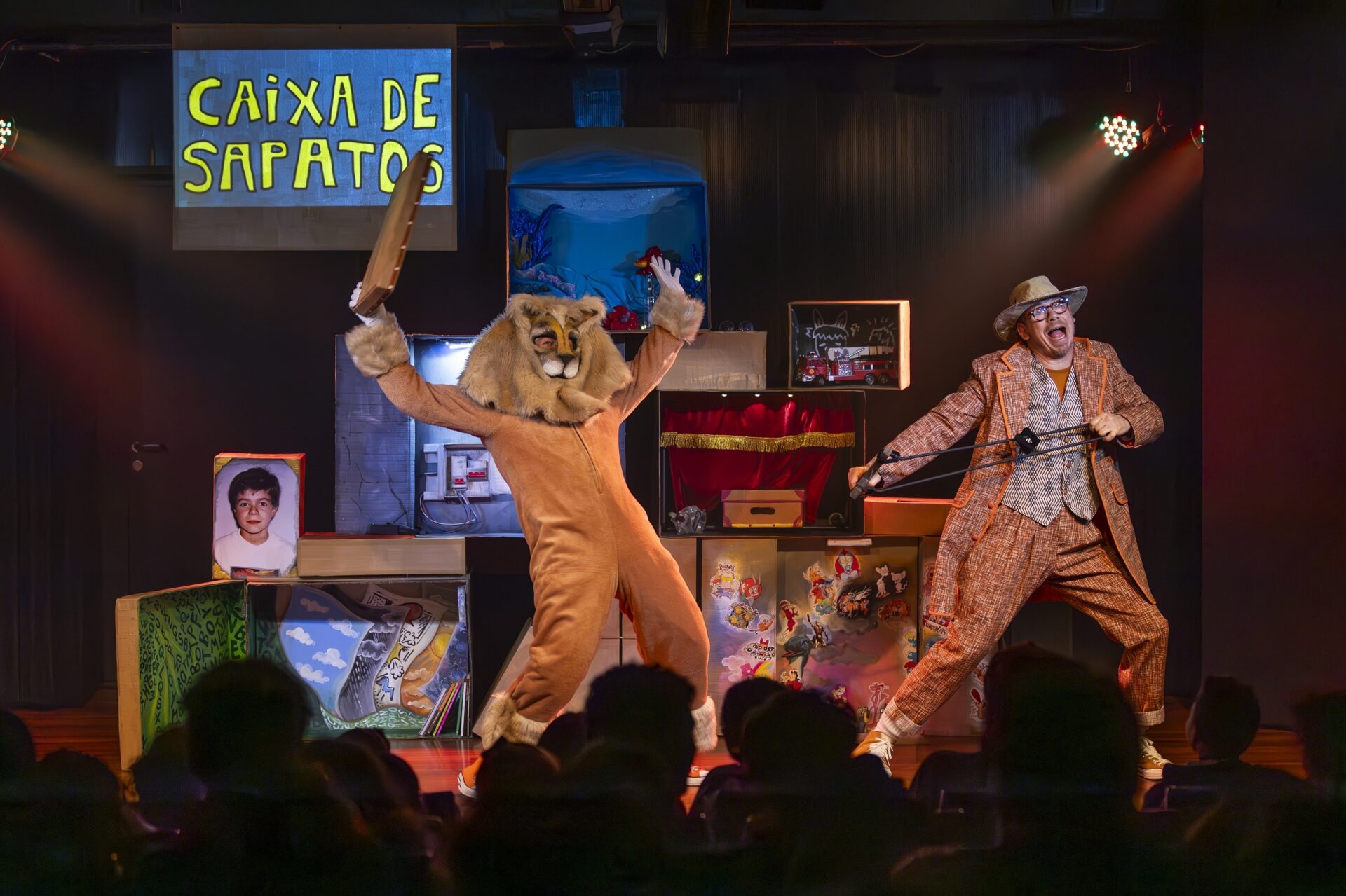 Dois atores abrem caixas revelando memórias, algumas vividas outras inventadas. Um leão em fuga, um inseto herói que usa óculos, a triste história de um carrinho de bombeiros e um avental bordado, um monstro que mora num buraco na parede, fotos antigas… Lembranças alegres e outras nem tanto. Desse relicário surgem brincadeiras de infância, relações de amizade, confronto com seus medos, viagens pelo imaginário, situações de bullying, e outras experiências. O que você colocaria na sua caixa de sapatos?