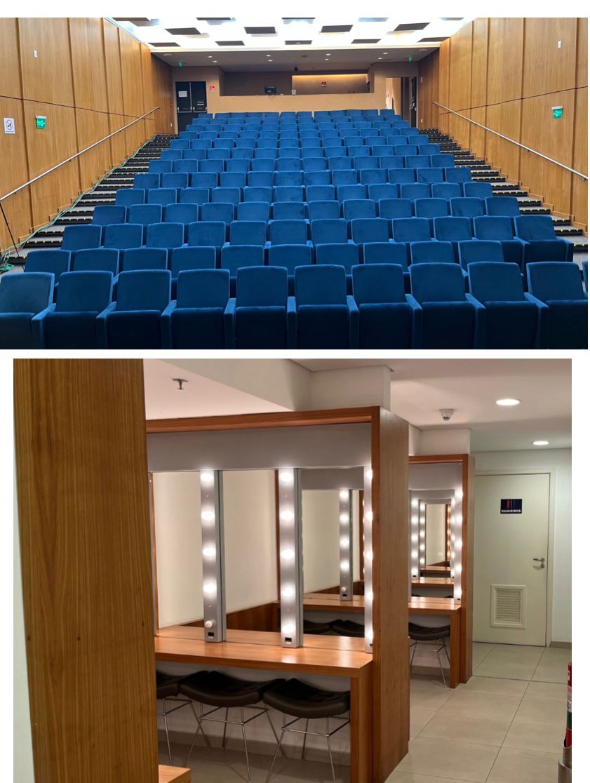 - Conforto: Um camarim equipado com seis bancadas para as produções.